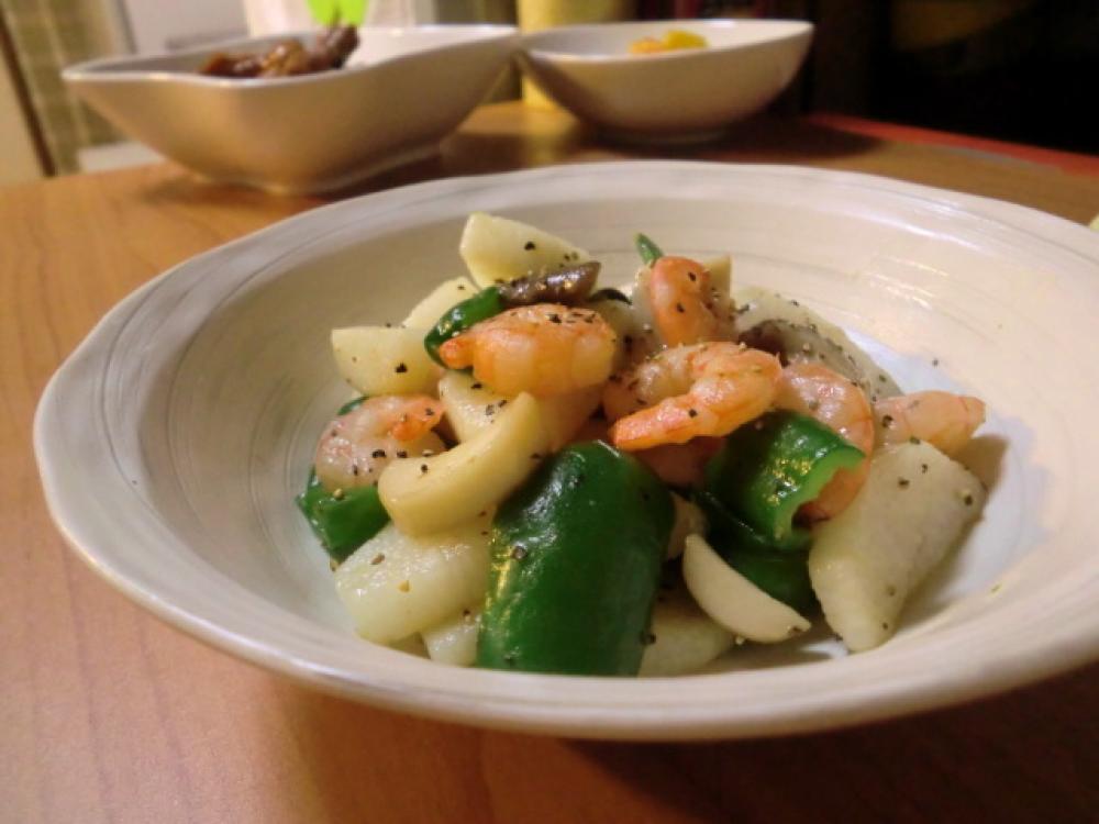 フライパンにオリーブ油を熱し、ニンニクを入れ、香りが立ったら赤唐辛子を入れ、1のエビ、長イモ、タケノコを入れて炒め、