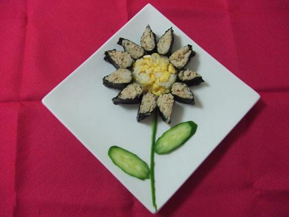ご飯の半分と鶏そぼろを混ぜて「桜」の涙型の要領で海苔で巻きます。(海苔は縦半分に切った大きさです)