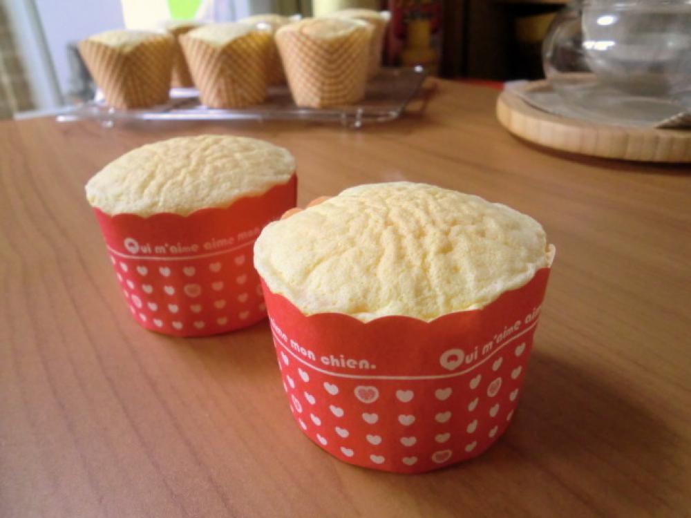 カップに生地を8分目まで入れ、150℃に予熱したオーブンで約20分焼きます。