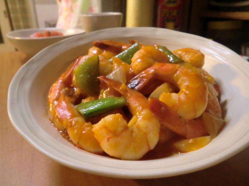 香りが立ってきたら、4を加えて煮立て、5のエビ、6の野菜を戻し入れて、合わせます。