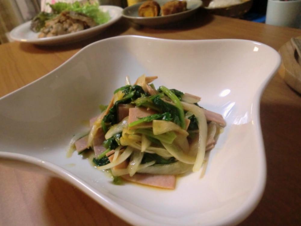 ホウレン草は、洗って濡れたままラップをかけて、電子レンジで加熱し、水にさらします。
