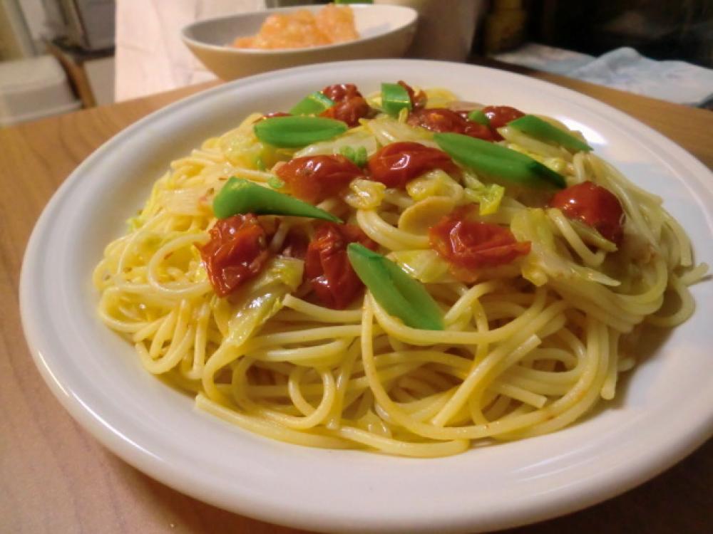 プライパンにオリーブ油と1のニンニク、赤唐辛子を熱し、ニンニクがキツネ色になったらキャベツ、プチトマトを加えて炒め、