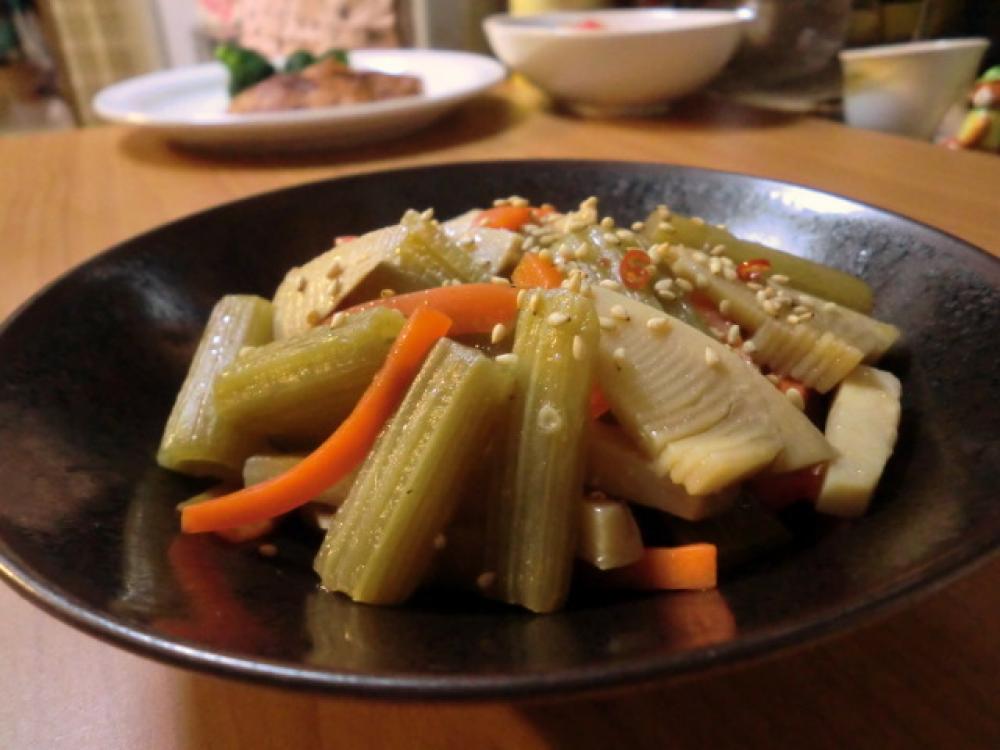 鍋にサラダ油をひき、2の赤唐辛子、ニンジン、タケノコ、1のフキを加えて炒め全体に油が回ったら、Aの材料を加え、