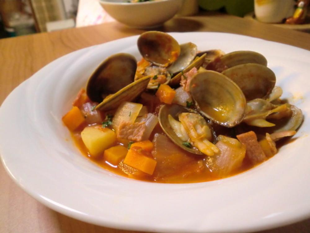 4に水、ローリエ、コンソメキューブを加えて加熱し、煮立ったらアサリを加えて貝が開くまで煮ます。塩、コショウで味を調えます