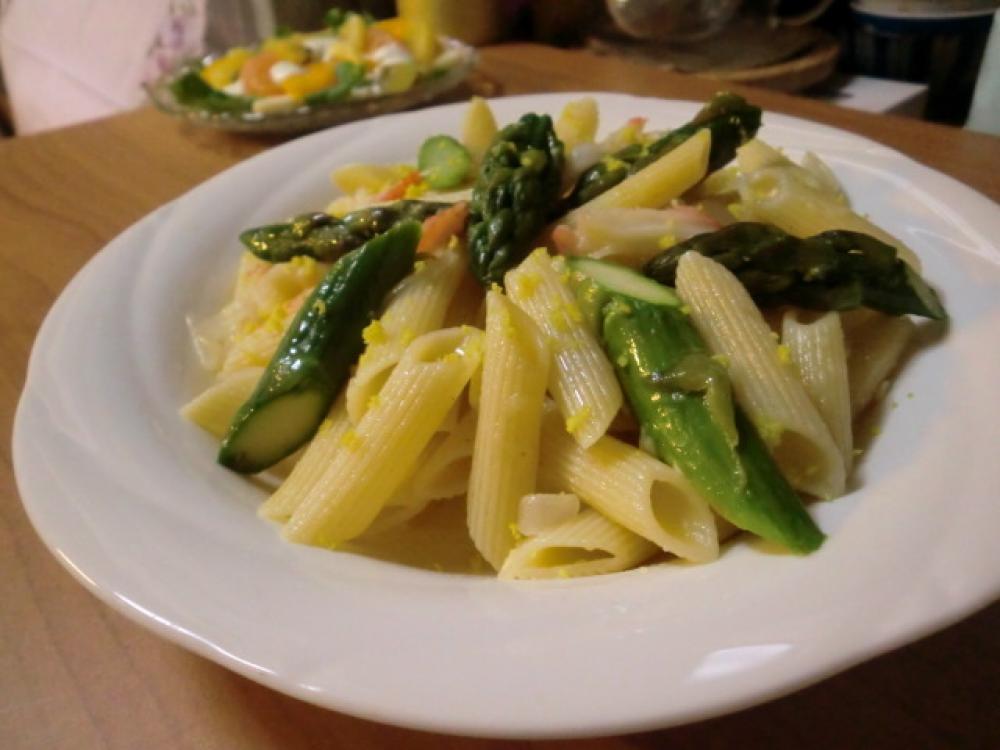 たっぷりのお湯に塩(分量外)を加え、ペンネを茹で始めます。茹で上がり2~3分前に、1のアスパラを加えて、一緒に茹でます。