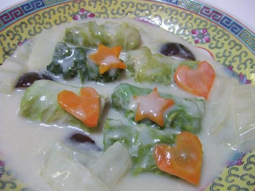 白菜は柔らかい所と固い所に分けて、柔らかい所はラップして2分くらいチン!固い所は短冊切りにしてスープに入れる用です。