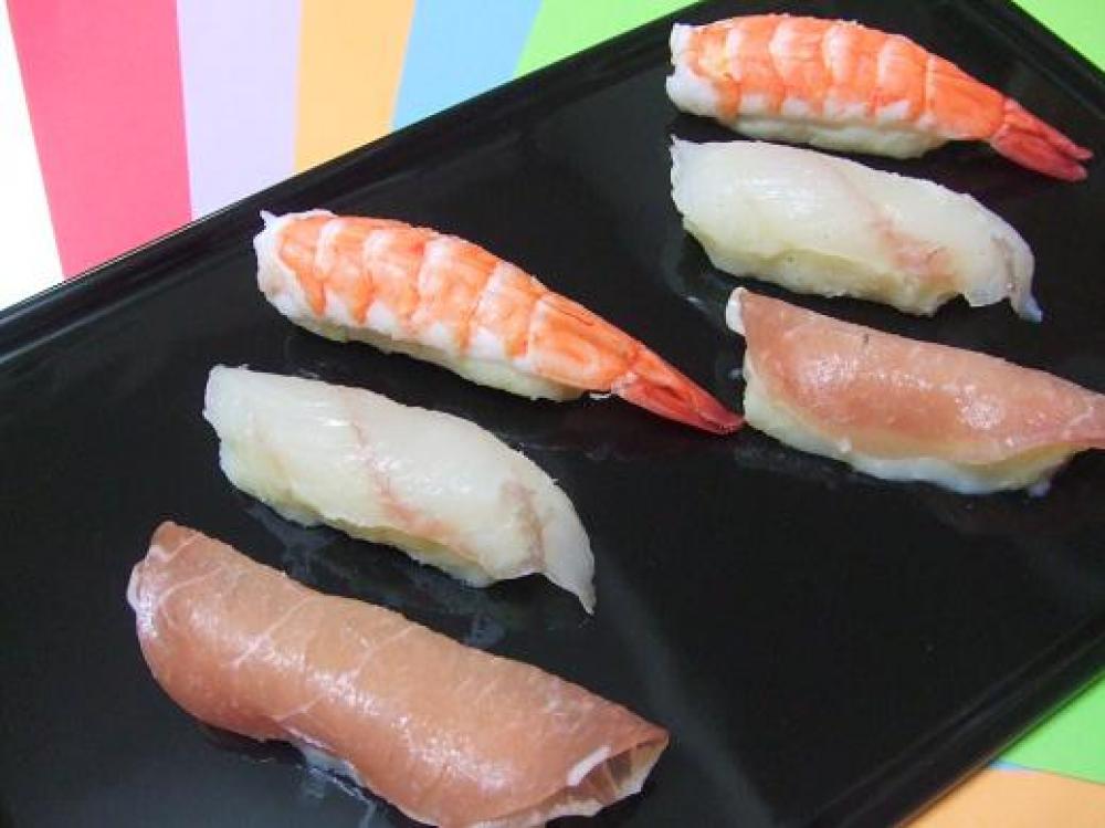 マッシュポテトを握り寿司のシャリに見たてて握ります。[手に少し水を付けると、まとめやすいです]