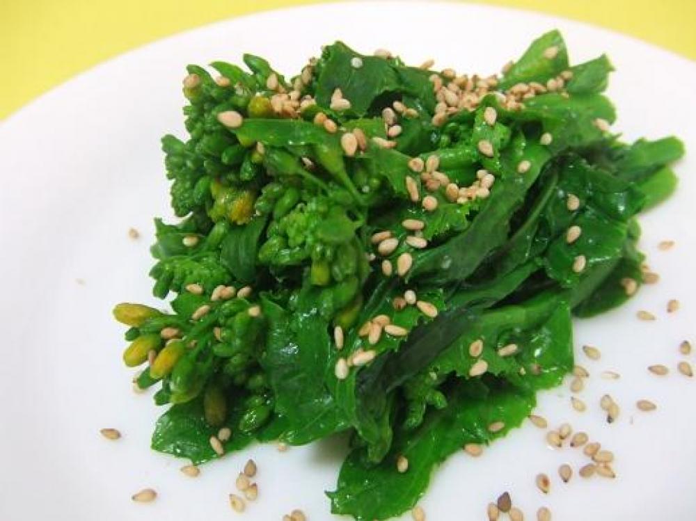 お鍋に、水を入れて沸騰させて→ゴマ油&塩&おろしにんにくを入れて。菜の花を投入!菜の花を投入!