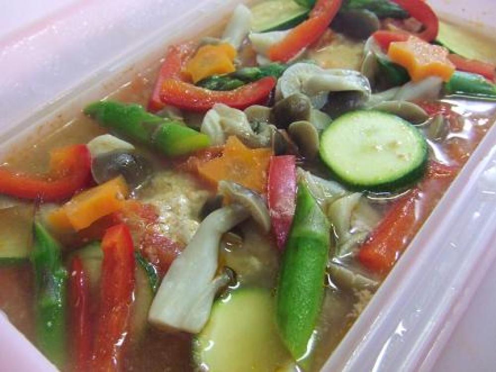 2をルクエに置いて、混ぜておいたBを上からかけて、人参・ズッキーニ・しめじを端に並べて、電子レンジで5分チン!