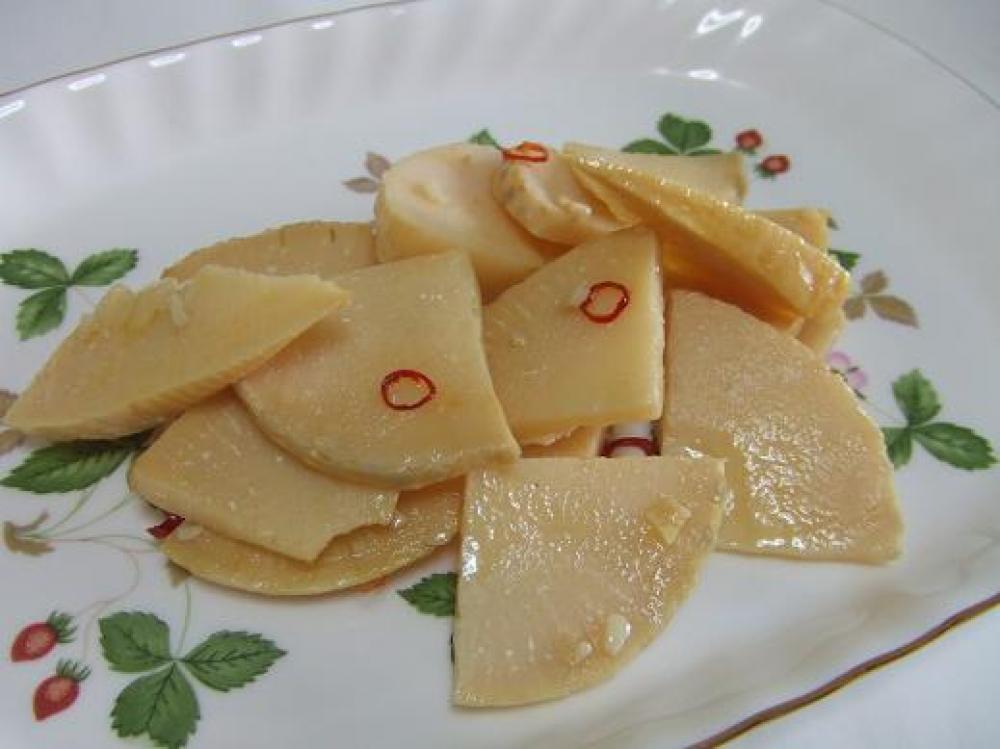 フライパンにオリーブオイル&にんにく&唐辛子を入れて弱火にかけ、香りがたったら、たけのこを入れます。
