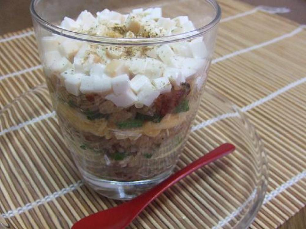 ガラスのグラスなどに、うなぎご飯⇒錦糸卵⇒オクラ⇒うなぎご飯⇒錦糸卵⇒オクラ⇒うなぎご飯と段々にします。