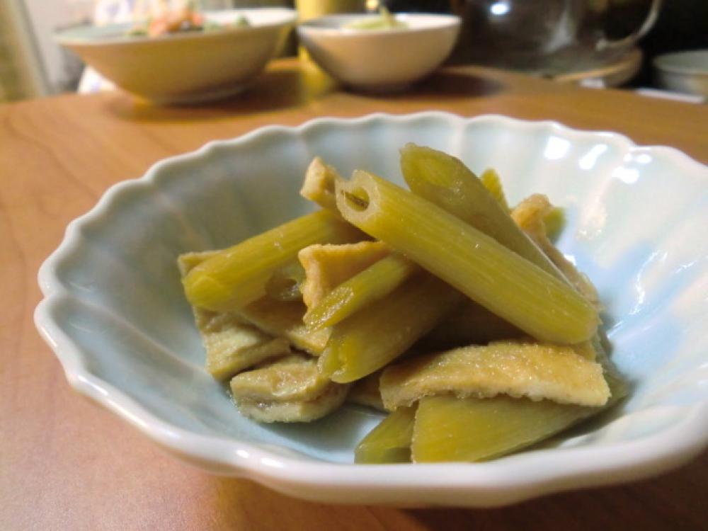 下処理したフキを、4~5cmの斜め切りにします。油揚げは、熱湯をかけて油抜きし、短冊切りにします。