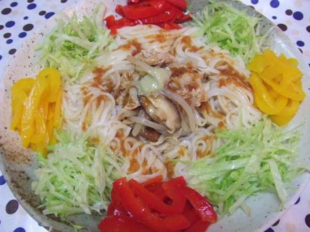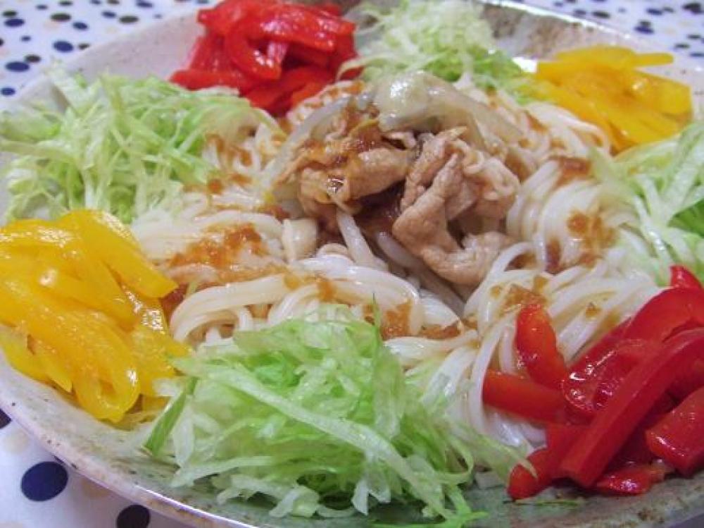 ![]() 豚肉・もやし・椎茸を一緒にして中央に、その外側にそうめん周りにレタス・パプリカを盛り、Bの残りを上からかけて頂きます。
