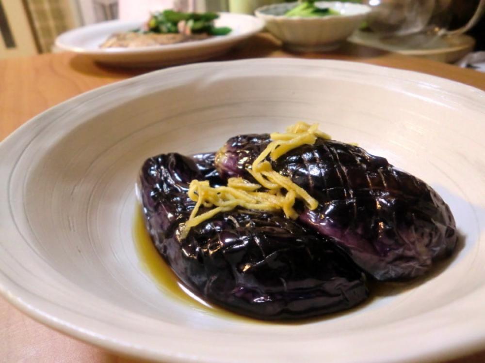 ③にショウガを加え、②のナスを入れてしばらく置き、味をなじませます。