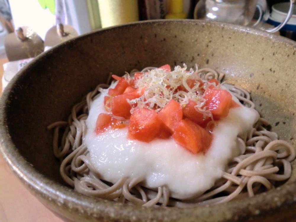 器に①を盛り、②の長イモをかけ、トマト、じゃこをのせます。だし汁少々で薄めた、めんつゆをかけて、いただきます。