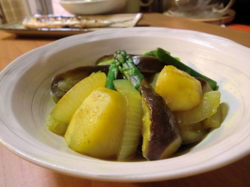 鍋にゴマ油を熱し、①の玉ねぎとナスを炒め、じゃがいもと水2カップを加え、Aを加えて2~3分煮ます。