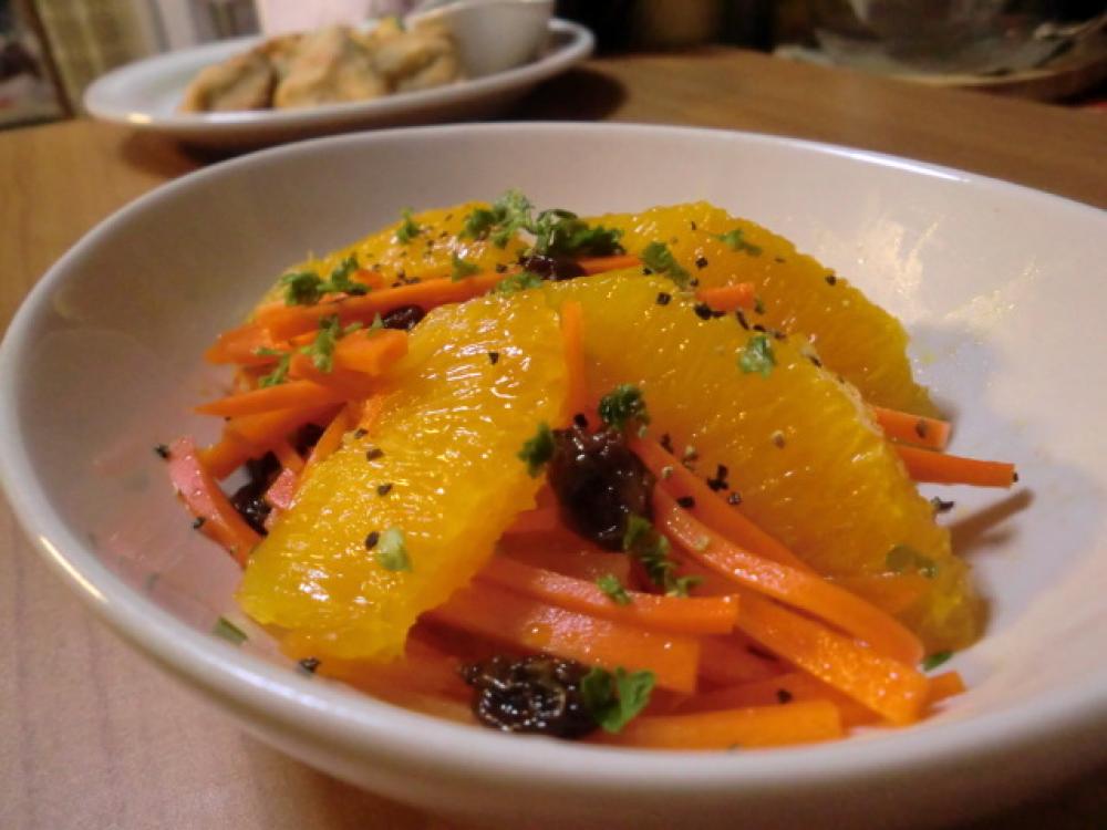 1のニンジンの水気を絞り、2のオレンジ、レーズンを合わせ、3のドレッシングで和えしばらくおいて、味をなじませます。