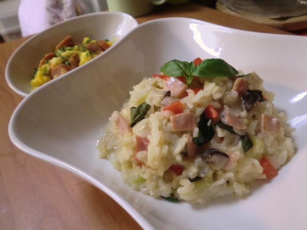 鍋にオリーブ油を熱し、1の野菜、ハムを入れて炒めます。