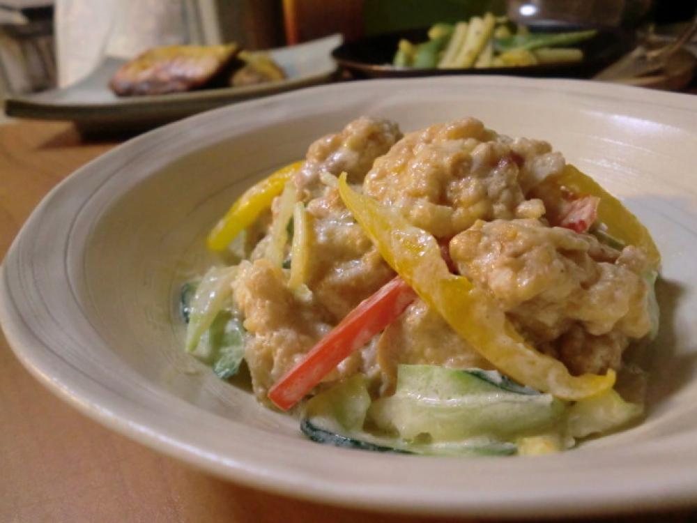 ★の材料を合わせて衣をつくり、2をくぐらせて、たっぷりつけ、170℃の油でキツネ色に揚げます。