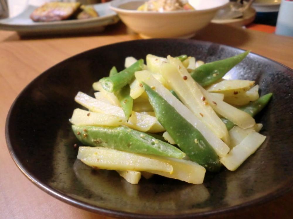 フライパンにオリーブ油を熱し、①のジャガイモ、インゲンを入れて炒めます。