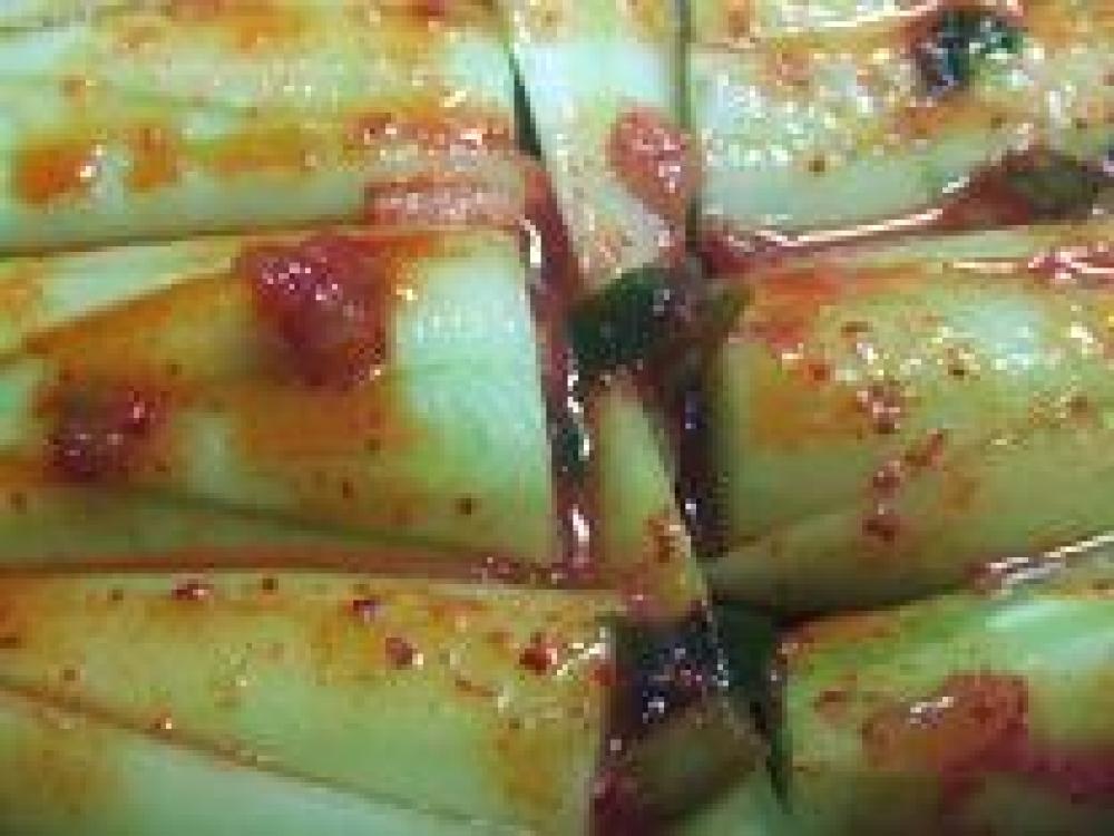 ![]() キムチの汁、又はキムチの素で軽く揉んで→容器に入れて冷蔵庫で半日くらい置いておきます。(でも、まんまでもOKです)