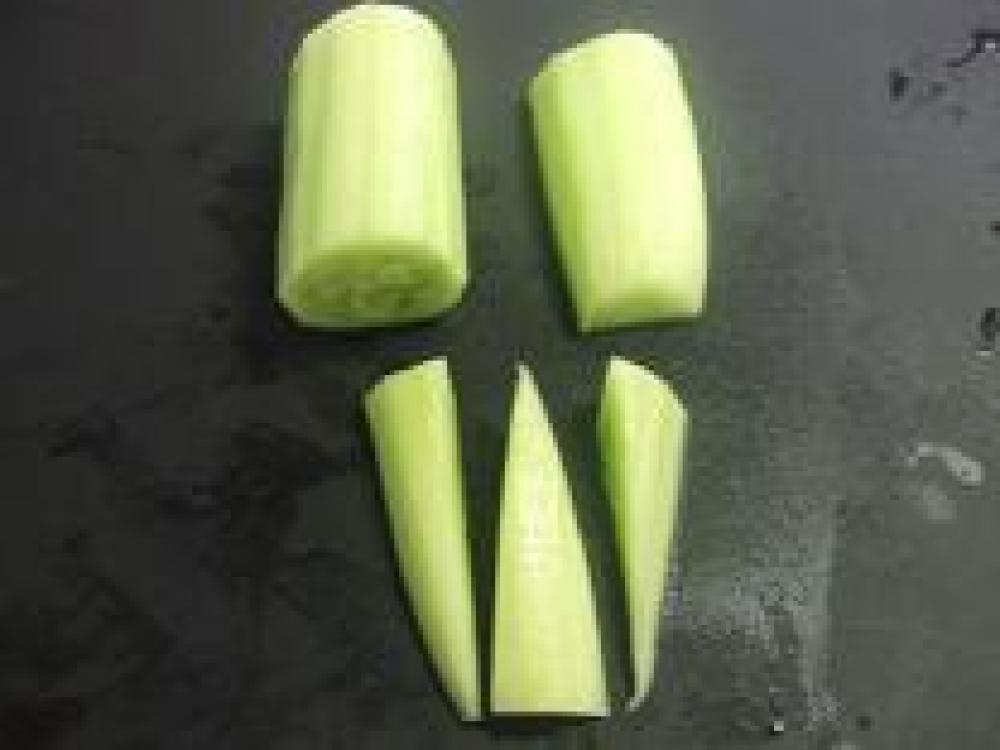 ![]() きゅうりは、皮をピーラーで剥いて、→真ん中から切って(左上)→それを半分に切って(右上)→それぞれ3等分して(下)