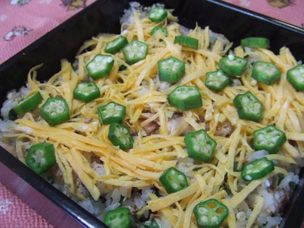 ![]() 温かいご飯にAを合わせ混ぜます。(扇がなくてもOK)ご飯にBの材料を混ぜ、上からオクラと錦糸卵を散らして出来上がり!
