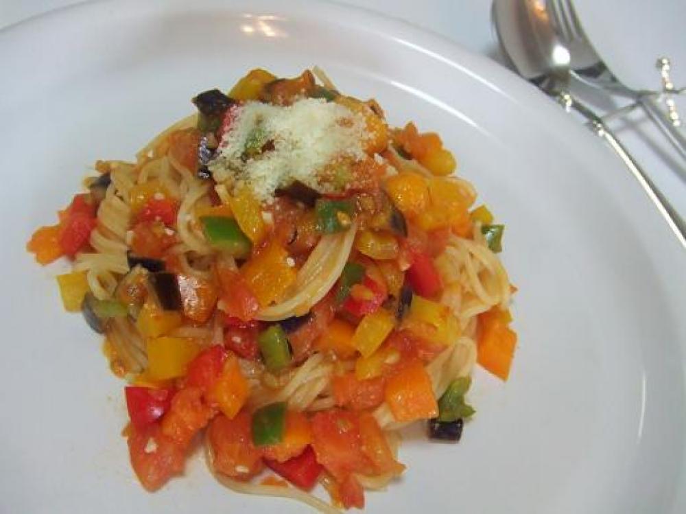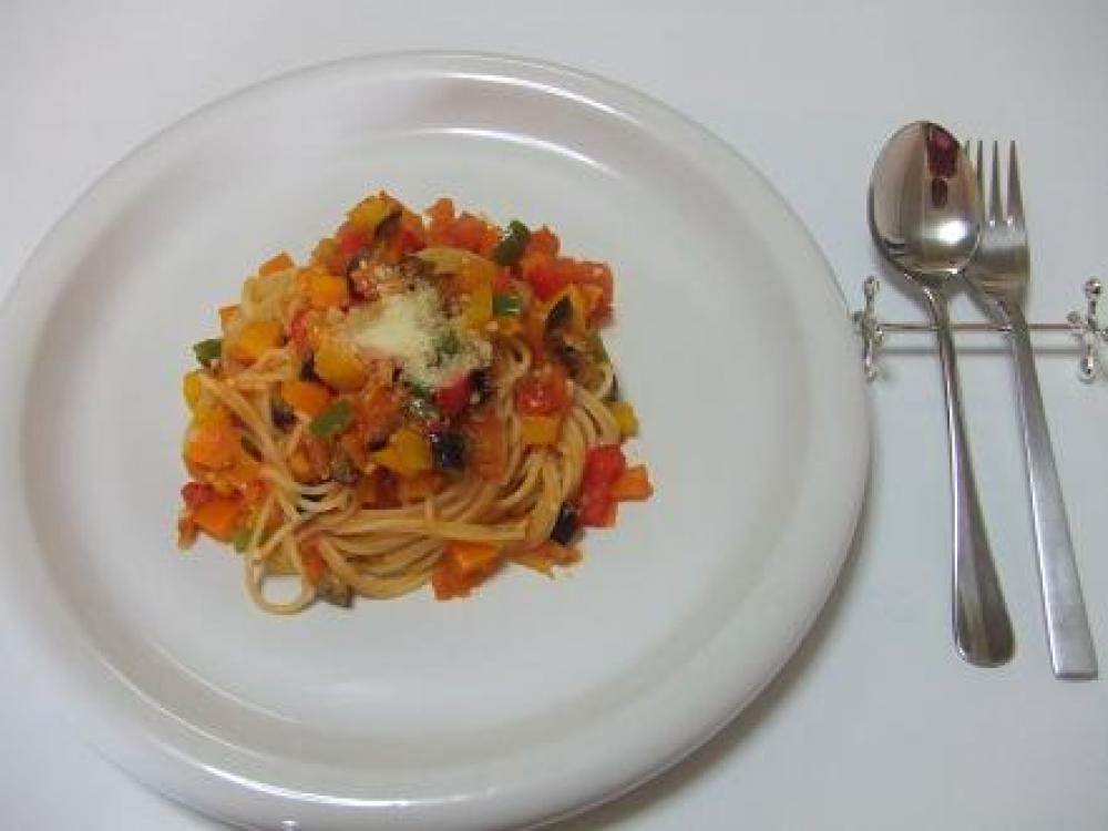 茹であがり1分半前に玉ねぎ&茄子を、30秒前にパプリカ&ピーマンを火を止める直前にレタスを入れて一緒にあげます。