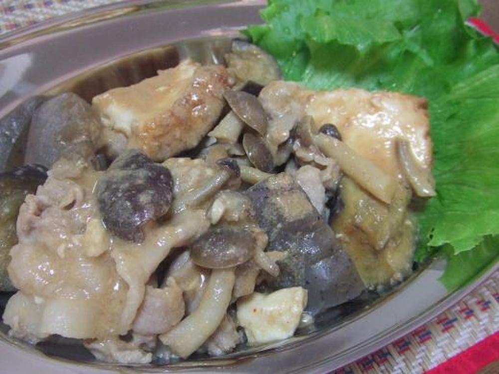 フライパンに、お湯を沸かして塩少々入れて、きのこ類&茄子&豚肉を入れて9割火を通してザルにあげておきます。