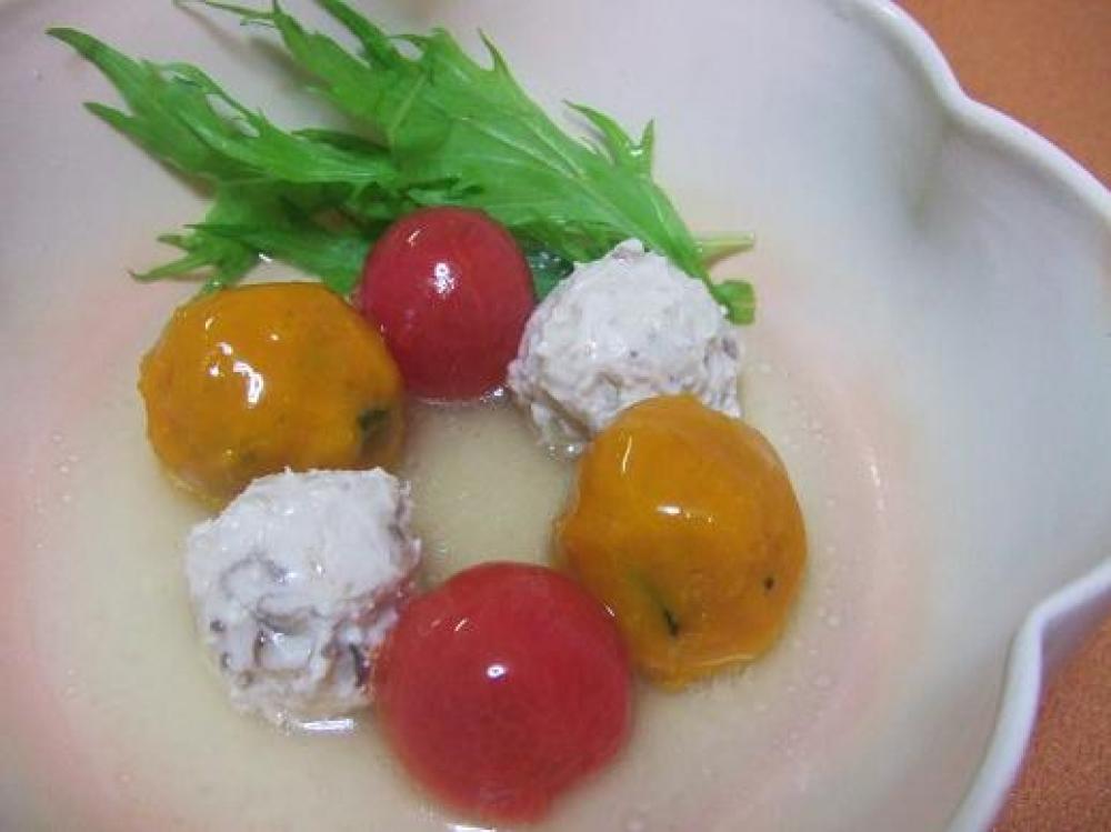 鶏団子&トマト&かぼちゃ団子&水菜をお椀に盛ります。