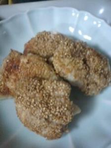 出来上がったマリネに、小麦粉を分量の水で溶いたものを、両面につけて、ごまをまぶします。あとは、フライパンで焼くだけ。