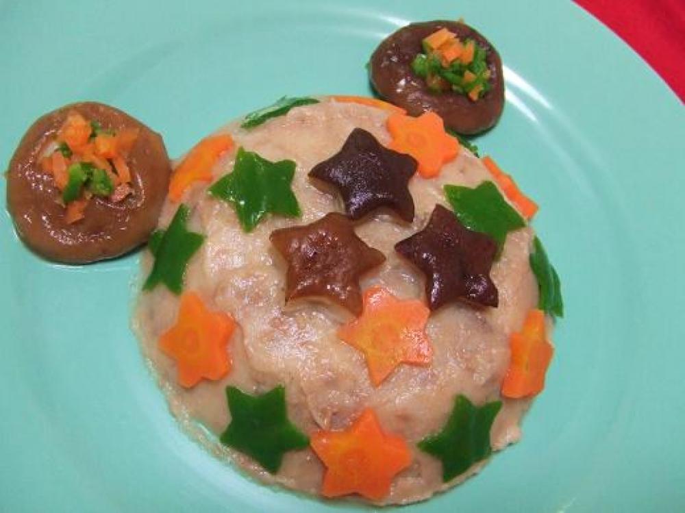 マッシュ&ミートを混ぜ合わせて型などに入れて器に盛ります。