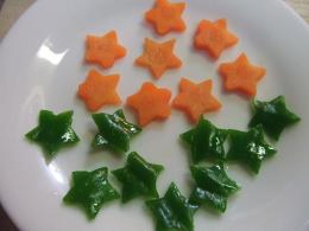 ![]() 人参とピーマンを星型に抜き、切り落としはみじん切り。人参に軽く塩してシリコンスチーマーで2分、ピーマンは1分チン。