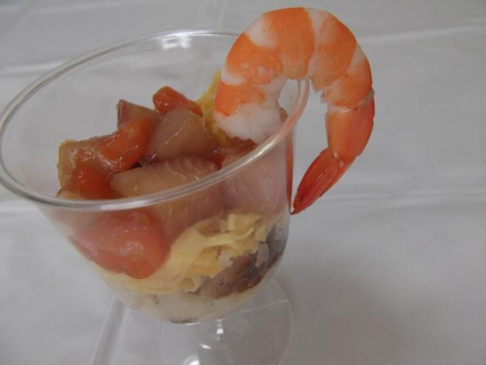 カップに盛り付け、錦糸卵・漬け刺身・茹で海老を飾ったら出来上がり!