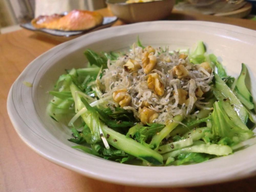 くるみは適当な大きさにくだいて、じゃこと共にプライパンに入れ中火で焦がさないように、乾煎りし、粗熱をとります。