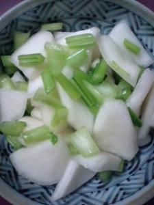 ![]() かぶの皮をむいて、4等分する。それを2㎜の厚さのいちょう切りに。塩をふって、よくもみます。