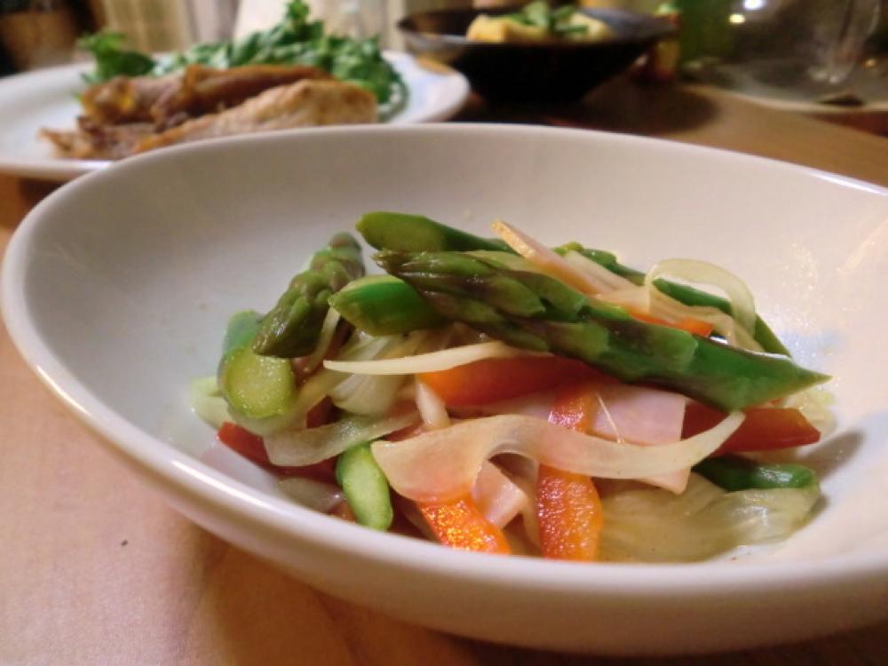 アスパラは、茹でるか、電子レンジで加熱し、冷水にとり、水気を切って、4~5等分に切ります。