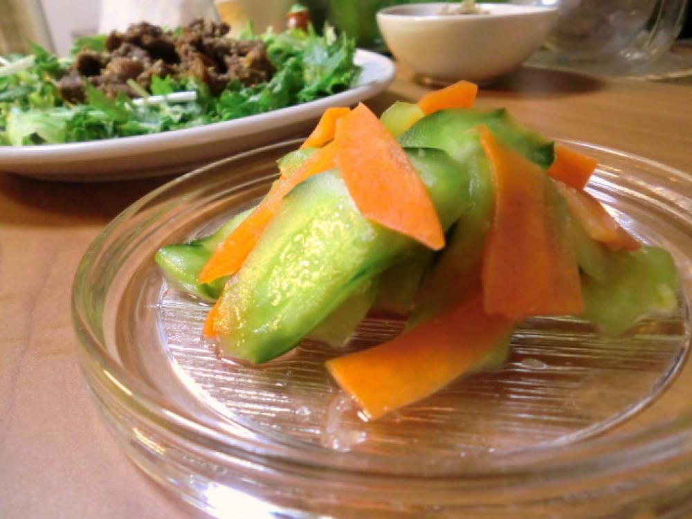 キュウリ、ニンジンは、皮をむいて、斜めうす切りにし、塩をふって混ぜ、しばらくおいて水洗いし、水気を絞ります。