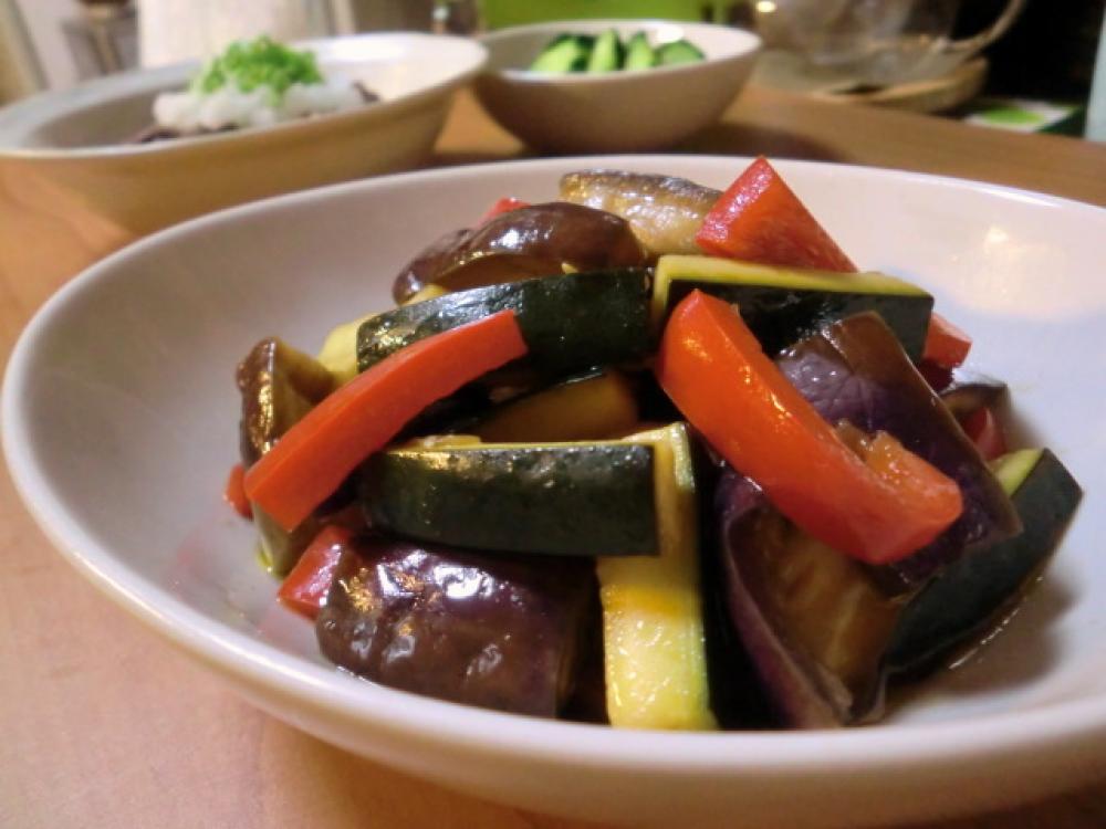 ナスは3cm長さのスティック状に切り、水にさらし、水気を切ります。ズッキーニとパプリカも大きさを揃えて切ります。