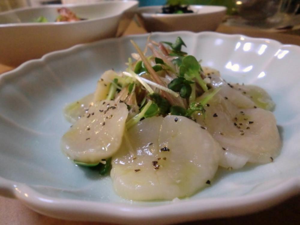 器の中央に①の野菜を盛り、その周りにホタテを並べ、②のドレッシングをかけます。