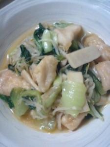 次に、チンゲン菜→もやし→鶏肉→エリンギの順にいれ、仕上げ用のタレであじをからめていきます。