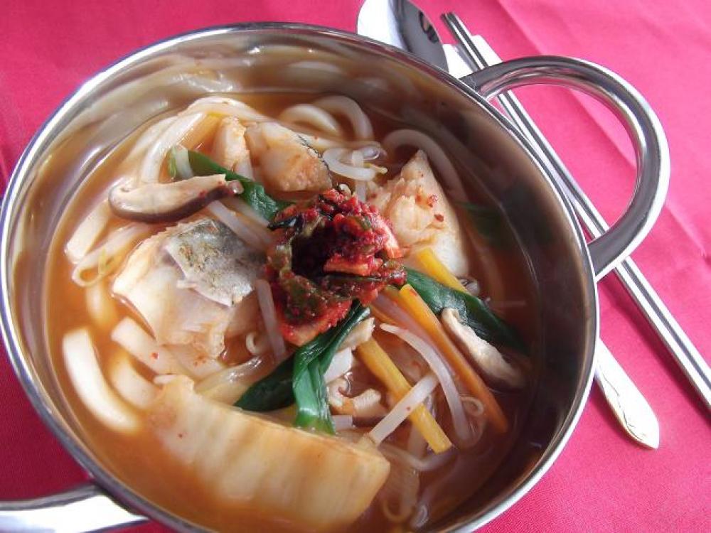 うどんが煮えたらニラ&キムチを入れて塩で味をととのえて香りのごま油を入れて再沸騰したら火を止めて器に盛ります。