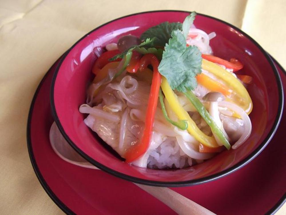 ご飯→豚肉→あん、とかけてトッピングに香菜をのせたら出来上がり!