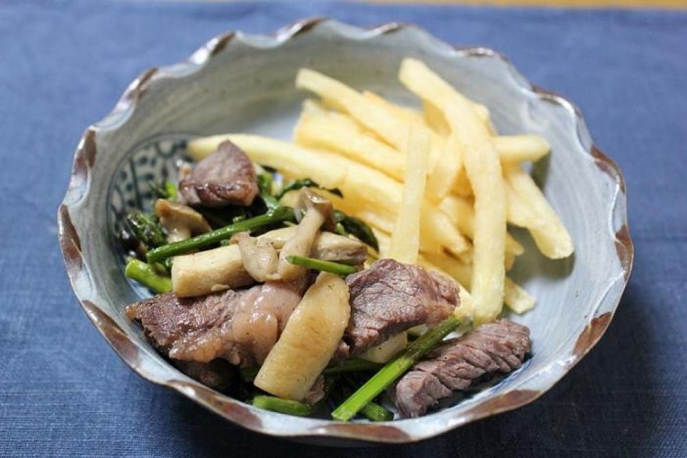 しんなりしたら牛ステーキ肉を加えて炒め、しょうゆ・塩コショウで味付けをしたら出来上がり。