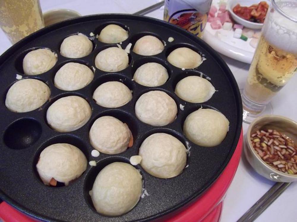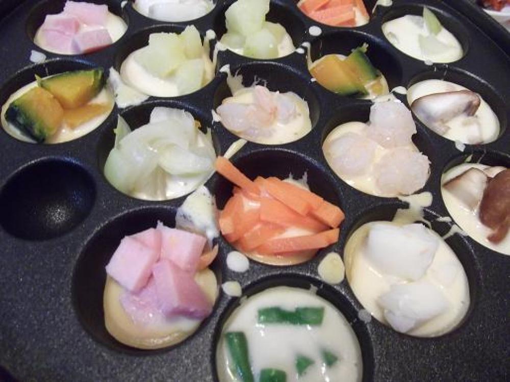 ![]() たこ焼き器にごま油を敷いてAの生地を流し入れ、お好みの具材を入れて、生地を足して、ひっくり返してまんまるに作ります。