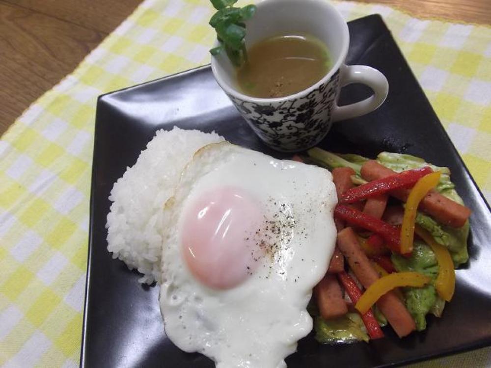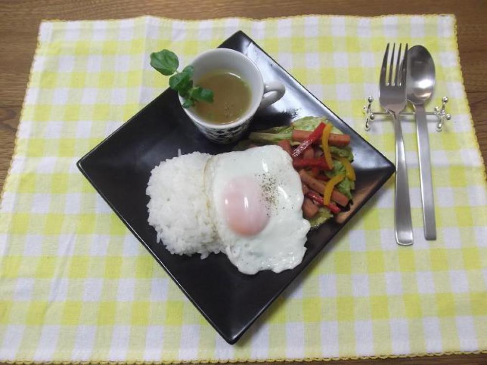 ![]() プレートに、ご飯・おかず・目玉焼きを盛り付け、黒コショウを振ります。一緒にスープも置いたら出来上がり