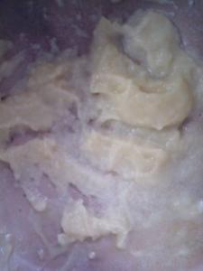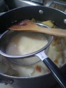 ![]() 人肌ぐらいまで温度が上がったら野菜を煮ていた鍋に移します。この時、そのまま入れると、ダマになってしまうので、こし網を通し