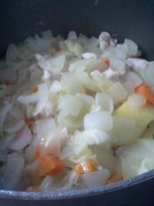 鶏肉を、ひと口サイズに切ります。玉ねぎ、人参、キャベツ、じゃがいもも、ひと口サイズ。