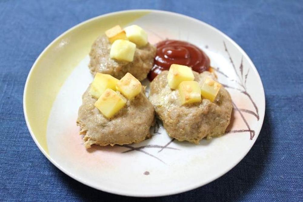 ハンバーグに角切りチーズを3個ずつのせ、オーブン(1,300kw)で10分間焼きます。