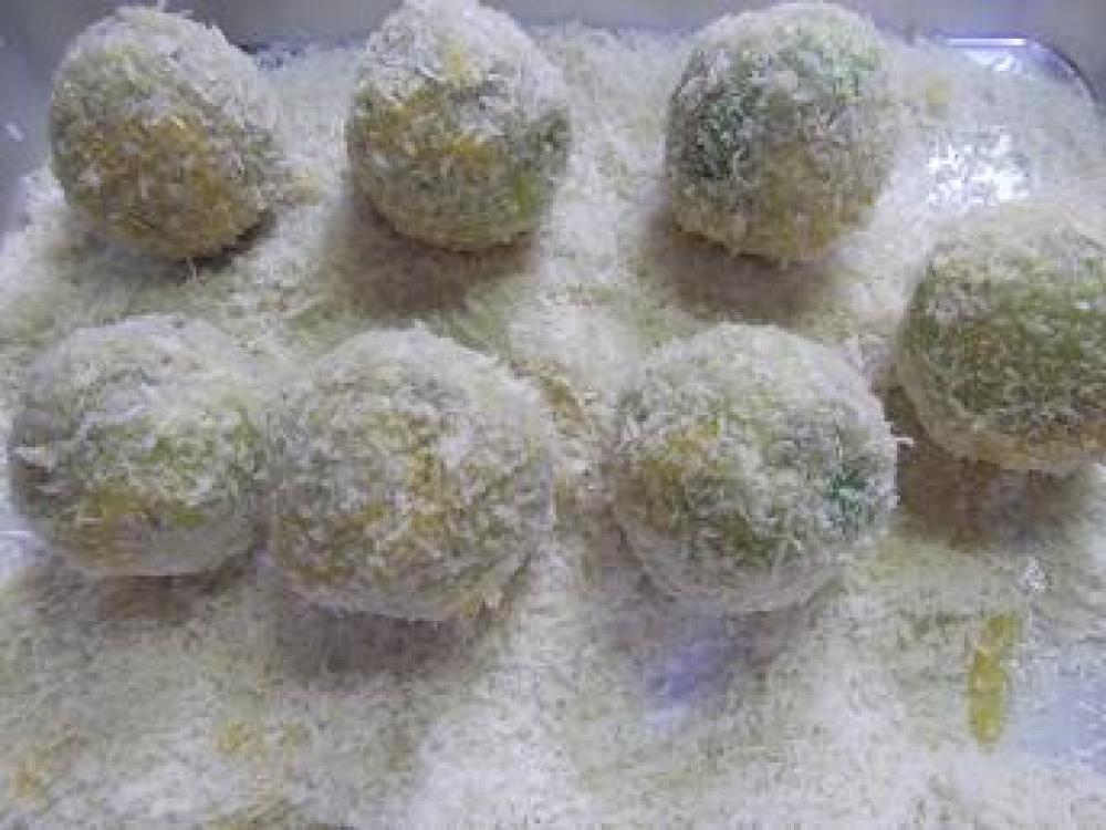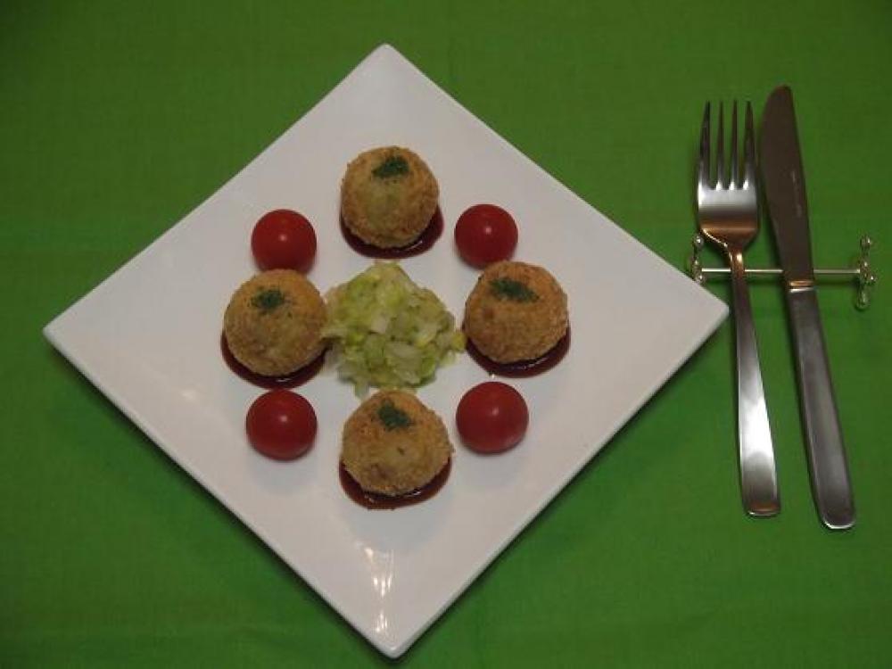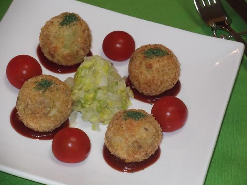 ![]() 6を丸めて、小麦粉→溶き卵→パン粉の順につけます。中温でキツネ色になるまで揚げます。